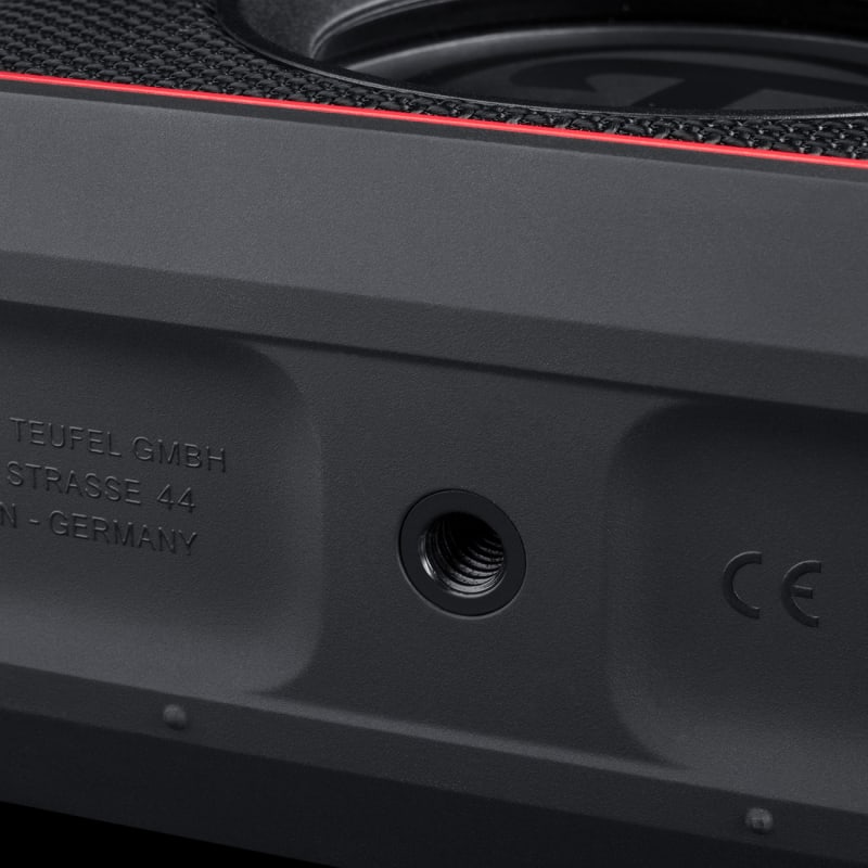 - Bedientasten am Gerät, AUX-Audioeingang, Akkuanzeige, M4-Gewinde zur Aufnahme von Stativen